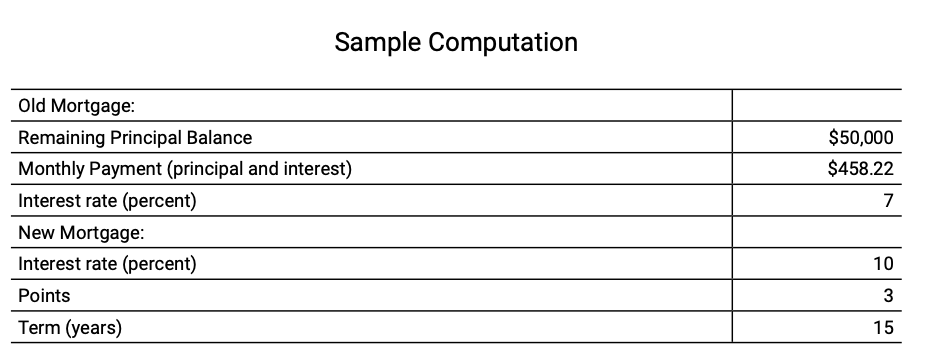The Agency must know the remaining principal balance, the interest rate, and monthly principal and interest payments for the old mortgage as well as the interest rate, points and term for the new mortgage to compute the increased mortgage interest costs. If the combination of interest and points for the new mortgage exceeds the current prevailing fixed interest rate and points for conventional mortgages and there is no justification for the excessive rate, then the current prevailing fixed interest rate and points shall be used in the computations. Justification may be the unavailability of the current prevailing rate due to the amount of the new mortgage, credit difficulties, or other similar reasons.