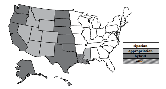 State laws on surface water rights generally follow one of three systems. In most Eastern states, water law is based on the doctrine of riparian rights. Broadly, water rights are allocated to owners of riparian land—that is, land adjacent to a body of water. Various laws in riparian-doctrine states regulate reasonable use to protect other riparian owners. In most Western states, where the water supply is more limited, water law is based on a prior appropriation system. Under this “first in time, first in right” concept, water rights are allocated based on when a person puts a quantity of water to actual beneficial use, regardless of whether that person owns riparian land. Finally,several Western states (including California, Texas, and Oklahoma) originally recognized riparian rights but later incorporated an appropriation system, creating a hybrid system with both riparian and appropriation elements. Beyond these three surface-water-rights systems, unique variations apply in Hawaii and Louisiana, and pueblo water rights affect a few places in the Southwest. Groundwater rights in the United States are generally allocated based on ownership of overlying land, prior appropriation, or state management.1014